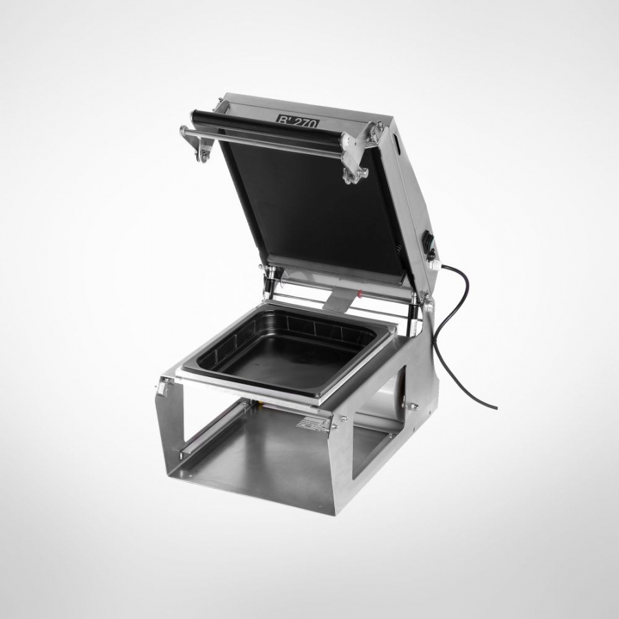 Maszyna zgrzewająca B-270 MV przeznaczona jest głownie do zamykania dużych pojemników o maksymalnym formacie 1/2 GN i 1/4 GN. Używana jest zwykle do pakowania zbiorczego większych porcji gotowych wyrobów. Urządzenie B-270 MV wykonane jest ze stali nierdzewnej, wyposażone w elektroniczny panel cyfrowy. Mechanicznie wspomagany system docisku gwarantuje stałe, niezawodne zgrzanie nawet bardzo dużych opakowań.
